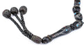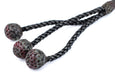 These genuine Islamic prayer beads are a traditional craft of Yemen. Prized for generations, beads such as these are intricately inlaid by a master craftsman to create the unique designs that characterize this art form. Look carefully and you will see that each silver dot has been individually applied and that no two beads are alike. Commonly referred to as Black Coral, these rare and highly sought-after beads are believed by some to have mystical properties. This unusual piece would be considered a special strand to be used for prayer or meditation. Yemen has historically been a primary source of Black Coral beads. Such beads have also been traded across the Red Sea and to other countries in East Africa. Antique such as these have some age and will show some signs of wear including imperfections. This unique strand of oval-shaped beads has been nicely finished with a traditional tassel and weighs approximately 44 grams. You will receive the exact strand pictured.