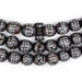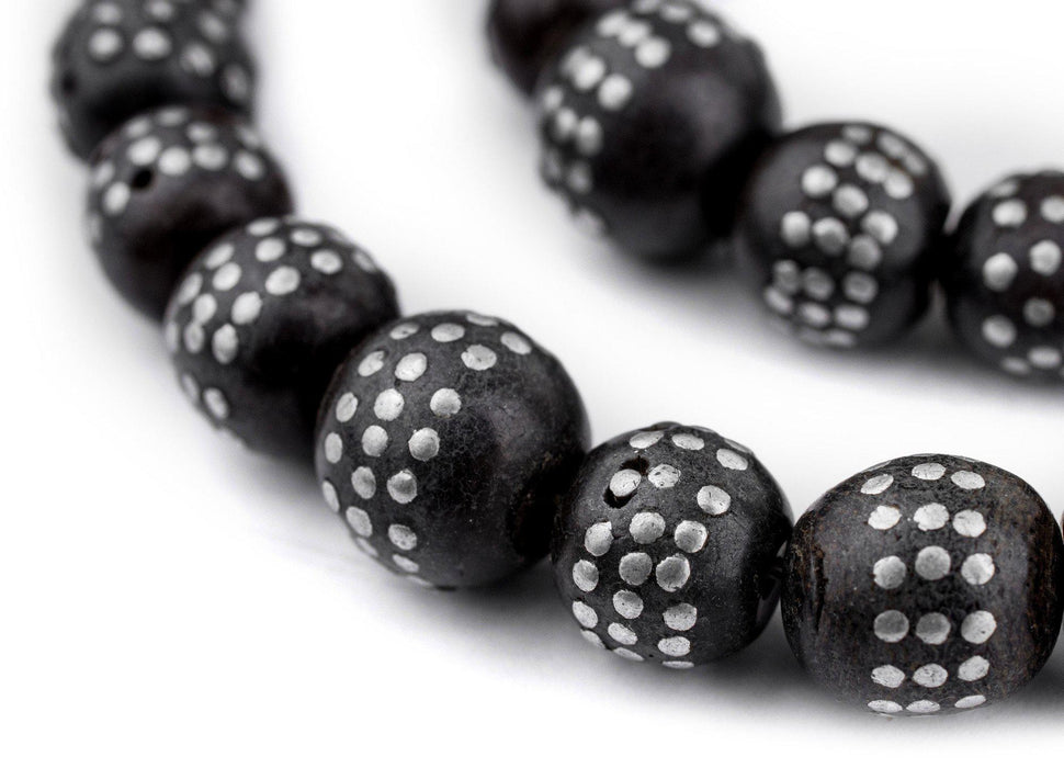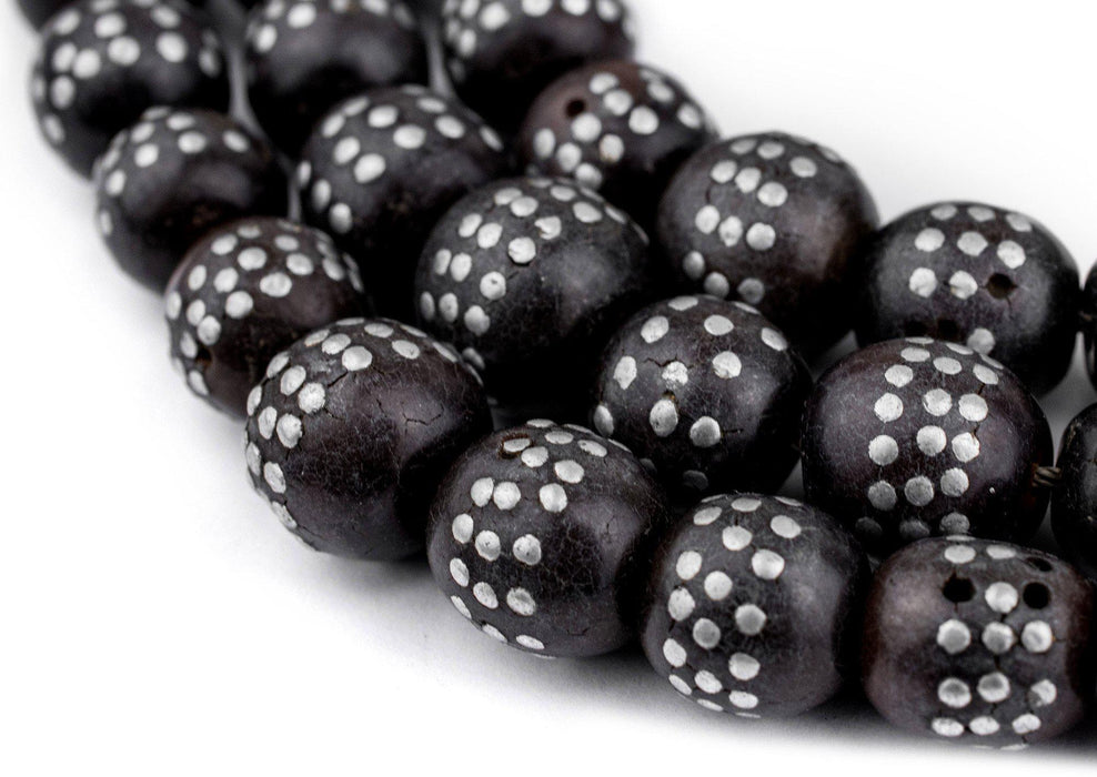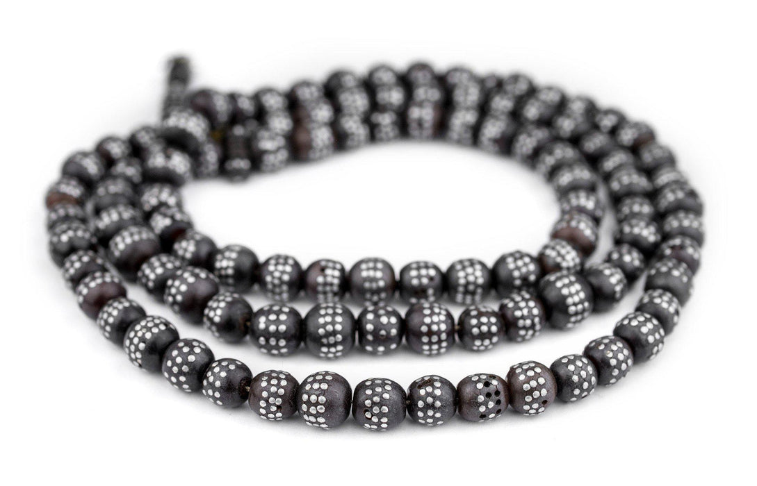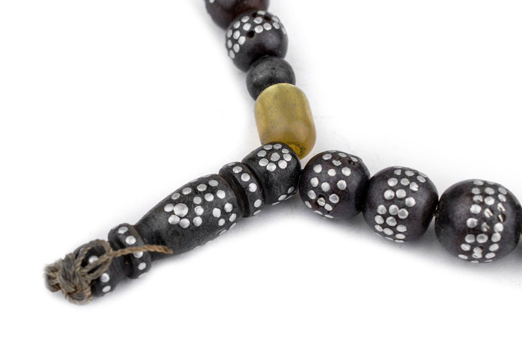 These genuine antique prayer beads are a traditional craft of the Arabian Peninsula. Prized for generations, beads such as these are intricately inlaid by master craftsmen to create the unique and beautiful designs that characterize this unique art form. Look carefully and you will see that each silver dot has been individually applied and that no two beads are alike. Commonly referred to as Black Coral, these rare and highly sought-after beads are believed by some to have mystical properties. This unusual piece would be considered a special strand to be used for prayer or meditation. Yemen has historically been a primary source of Black Coral beads. Such beads are also found in other parts of the Islamic world including North and East Africa where they have been distributed through the years by merchants and traders. Antique beads such as these have some age and will show signs of wear including imperfections. This unique strand of round-shaped beads has been nicely finished with a traditional end-piece. The strand weighs approximately 100 grams. You will receive the exact strand pictured.