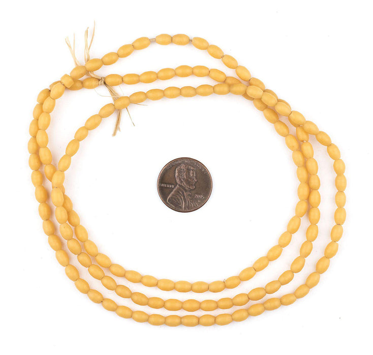 These vintage orange glass beads were originally produced in Czechoslovakia and sent to West Africa in the mid-20th century. Crafted in an oval shape, similar to the grain of rice, they are often referred to as "rice beads." Due to their vintage nature, they are becoming increasingly difficult to find. Each bead measures approximately 6 x 4mm with a hole size of 1mm. Strands measure approximately 32". Limited supply available. Get yours today!