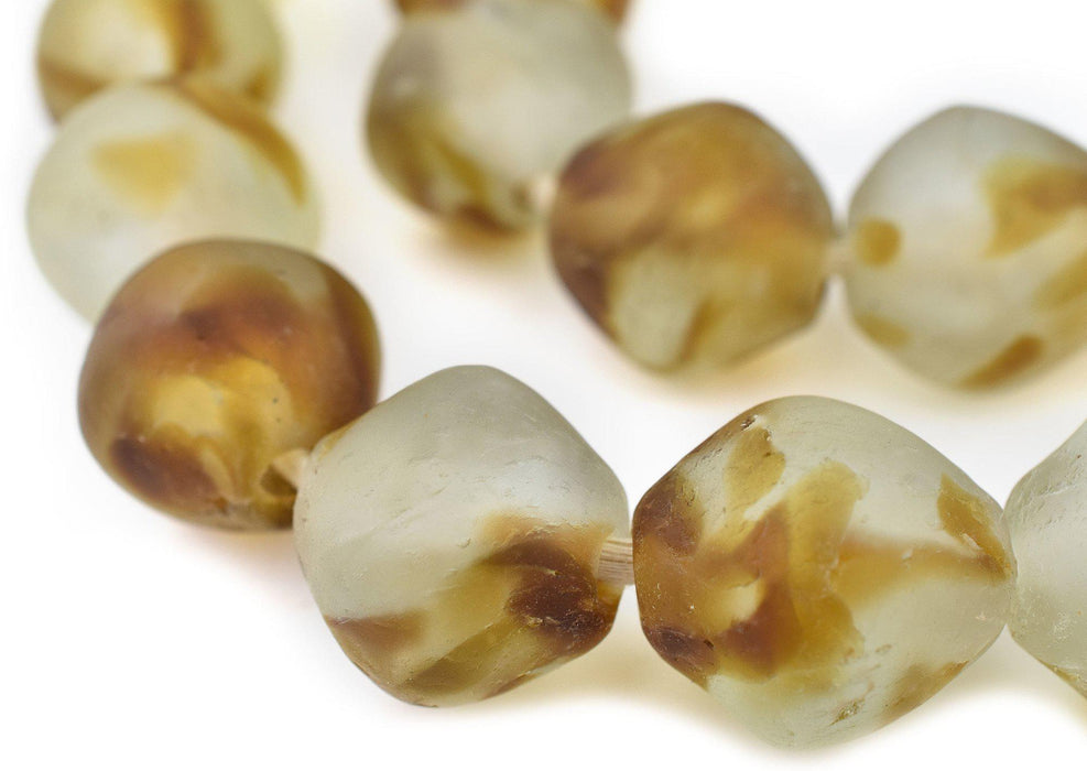 Recycled glass beads are a type of indigenously produced African bead from Ghana West Africa. These special beads are made using an old method that has been used for centuries. The glass itself is derived from a variety of recycled sources including old beverage and medicine bottles. The procedure for making the beads consists of a number of steps whereby powdered glass is poured into molds of clay and baked in a specialized oven. These beads are produced in large part by the Krobo tribe and are environmentally friendly. Because of the size of these beads, it is not uncommon for a strand to have a few beads with internal fractures. Non-USA buyers, please note that a heavy-weight surcharge may apply for this item. Please inquire in advance if you would like to pre-confirm this fee.