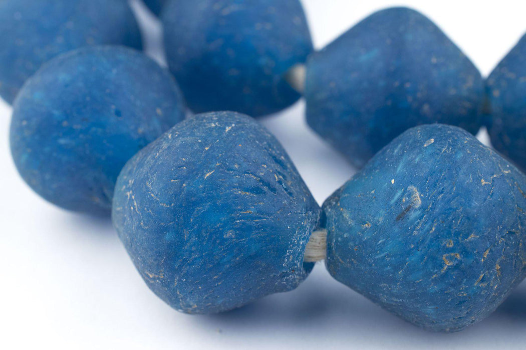 Take a look at this exceptionally large strand of jumbo-sized blue recycled glass beads. Large beads such as these are hard to find and even harder to find in good condition. The journey from Africa can sometimes be unkind to such large beads! This strand is sure to make an impression wherever it goes. Use these beads as centerpieces for special jewelry, as adornments for interior design, or even as a wall hanging to decorate your favorite room. You will receive a 31" strand with approximately 30 beads. Each strand is unique and may vary slightly from strand pictured.