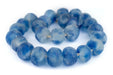 Take a look at this exceptionally large strand of jumbo-sized blue swirl recycled glass beads. Large beads such as these are hard to find and even harder to find in good condition. The journey from Africa can sometimes be unkind to such large beads! These beads are sure to make an impression wherever they go. Use them as centerpieces for special jewelry, as adornments for interior design, or even as a wall hanging to decorate your favorite room. You will receive a 30-32" strand with approximately 24 beads.