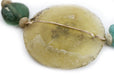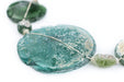Admire this unique strand of beads made from ancient glass pieces found in the region along the historic silk road. This strand is made of exceptionally large beads which is rare to come by, considering their exceptional condition. Commonly referred to as Roman Glass, the material for these beads is derived from ancient cups, vases, and perfume containers that have sustained the travails of time. If you look carefully, you will see that these beads have a unique patina endowed by the mineral deposits where the glass lay buried. Each glass piece has been individually drilled and threaded to create a strand. Due to their age and extensive travel, some beads may be chipped. You will receive the EXACT strand pictured. Only one available - get it before it's too late! Note that while the material is said to be of old, possibly ancient origin, the precise age of the glass has not been independently verified.