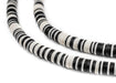 Take a look at this beautiful strand of black and white African vinyl beads. Beads such as these are found in Ghana and Nigeria where they are sometimes worn as waist beads. Older versions of vinyl beads were said to be made from recycled phonograph records. This strand measures approximately 34" with individual beads measuring approximately <0.28 x 6mm. These beads are light, fun to wear and also versatile for jewelry designs. Each strand is sold individually.