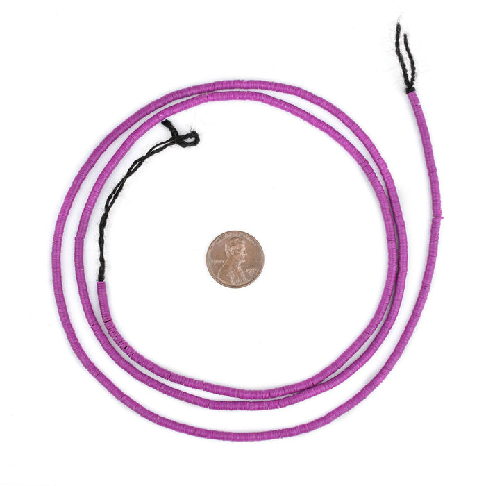 Take a look at this beautiful strand of magenta African vinyl beads. Beads such as these are found in Ghana and Nigeria where they are sometimes worn as waist beads. Older versions of vinyl beads were said to be made from recycled phonograph records. This strand measures approximately 35" with individual beads measuring approximately <0.28 x 3mm. These beads are light, fun to wear and also versatile for jewelry designs. Each strand is sold individually.