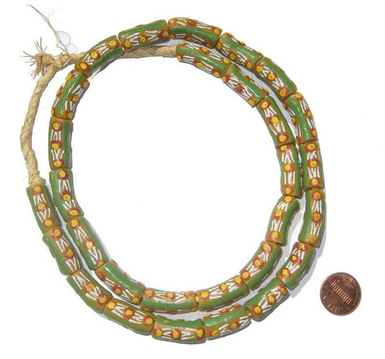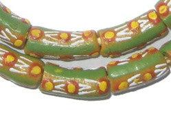 A beautiful strand of powder glass African beads, made by the people of Krobo Mountain ( Ghana , West Africa ) ,reproducing old Venetian FANCY trade beads. Made from bottles and other glass items that are turned into powder, then poured into molds in order to create this nice looking drum shaped beads. Decorations on the beads are made with a paste made of colored glass powder and water, which is applied using a thin wooden stalk. They are cooked a second time to fix the decor. The beads are handmade.