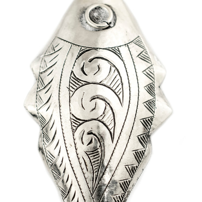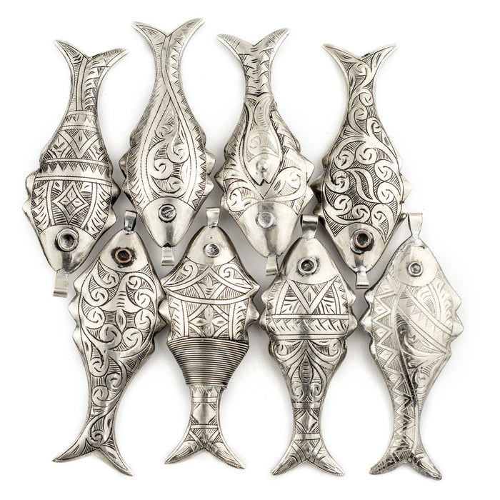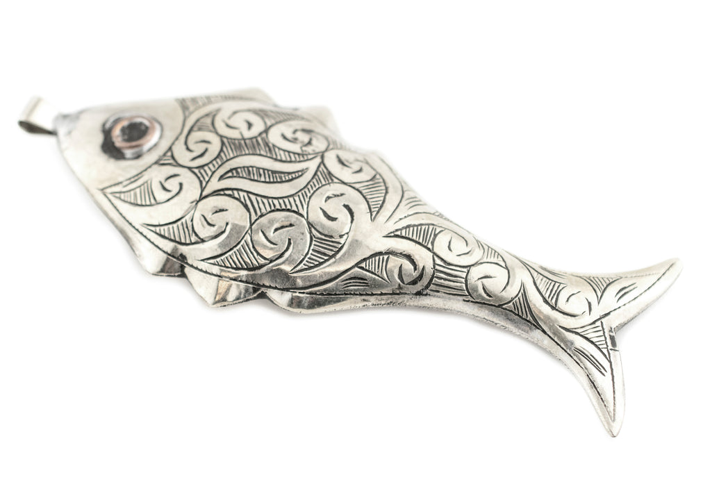 These silver fish pendants are handcrafted by Berber artisans in Southern Morocco. Each pendant measures 105 x 16mm with a stringing hole of 3.5mm. You will receive 1 pendant per order. Can be strung on a cord and worn as is, or incorporated into more nuanced jewelry designs. Pattern on pendant varies from pendant to pendant, as shown in photos. Grab a few for your DIY Design Kit today.