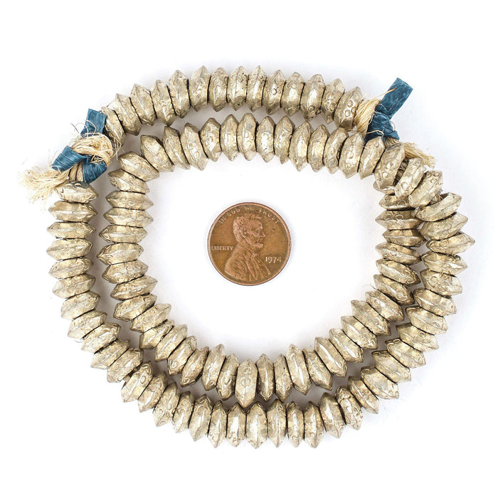 Check out this strand of unique white metal rings from the Wollo region of Northern Ethiopia. These handmade rings are individually crafted in a traditional design and make great adornments for jewelry creations. Individual rings measure 4-5mm wide by 11-12mm in diameter. Hole size is approximately 5-6mm. Up to 20% of rings may be 13-14mm. You will receive a full strand of 100 rings for each purchase.