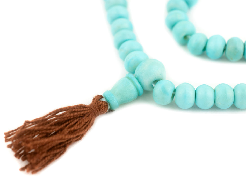 This strand of turquoise blue bone beads comes from Nepal. Pay attention and you will notice that each bead is 100% unique and has its own character. Each bead measures approximately 6 x 9mm, with a hole size of approximately 2mm. You will receive one strand measuring approximately 27". The beads are strung in traditional 108-bead Mala form. Grab a Mala for yourself today.