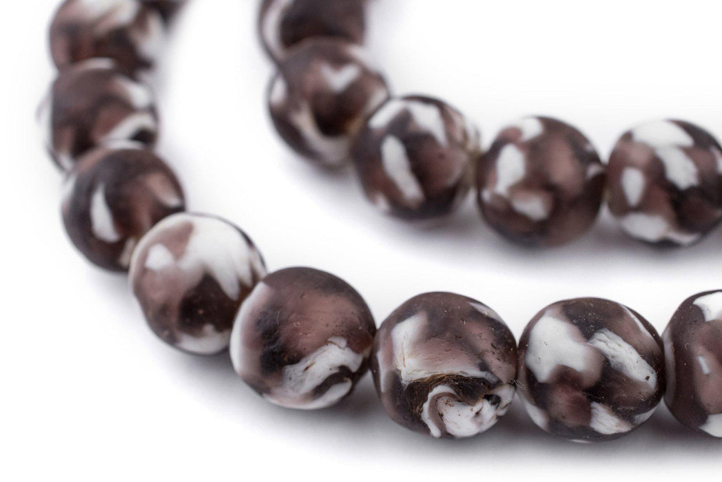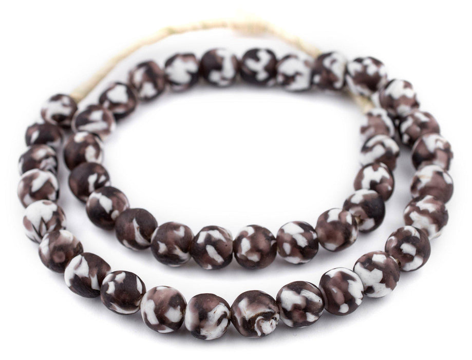 These beautiful recycled glass beads are handmade by artisans in the West African country of Ghana. Each bead is individually handcrafted through a traditional process passed down generation to generation. The steps involve crushing glass into tiny pieces, placing it in a mold, and then heating the crushed glass at high temperatures in a clay oven. Different types of glass are used including old cola bottles, broken tiles and windows, and other types of repurposed glass. The beads on this strand measure approximately 12 x 13-14mm with a hole size of approximately 2mm. Each strand measures about 29". Get your strand today!