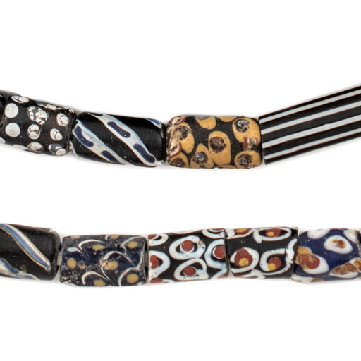 View full detailsAdd a touch of elegance to your jewelry creations with this Amazing strand of Assorted Black Fancy Venetian Mixed Trade Beads. These cylindrical gl...