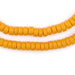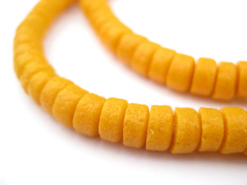 Checkout this beautiful strand of orange color Ghana glass disk beads. The process of making these beads is unique to Africa and has been used for over 1000 years. Pulverized glass of various colors is poured into a clay mold, using a cassava stem for the bead's hole. The mold is placed in a furnace and heated until the glass particles congeal without actually melting and the stem burns out. The Ghanaians have been making beads in this manner since the 1600s. Each bead measures approximately 3.5 x 7-9mm, with holes measuring approximately 2mm.