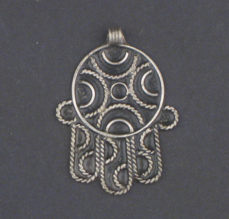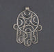 This artisanal silver-washed Hamsa pendant was made by a craftsperson in Morocco. The Hamsa is a traditional middle-eastern charm worn by people for protection from harm. This pendant measures 30mm wide x 40mm long.