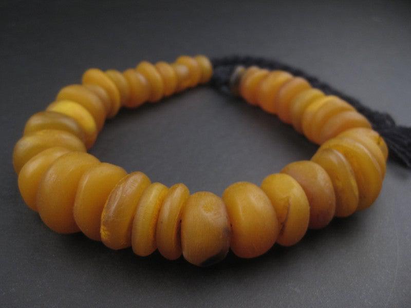 Hard-to-find amber colored horn beads from Morocco. These beads have been fashioned from natural materials and have a unusual texture that is unique to horn. The beads on the strand are graduated. May be worn as is or used for jewelry. Individual strands are unique.