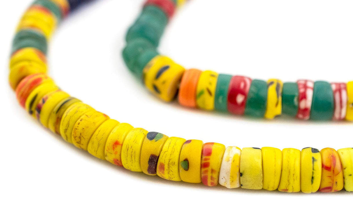 The unique look of kakamba beads is easily recognized among the beads of Africa. Originally produced in former Czechoslovakia, these beads are made using a special process whereby glass is pressed in a mold. Also known as prosser beads, these fun vintage African trade beads come in a variety of different colors and combinations. Each strand is unique. You will receive the exact strand shown in the photo. Bead and strand dimensions are approximate and may vary slightly. Get yours today!