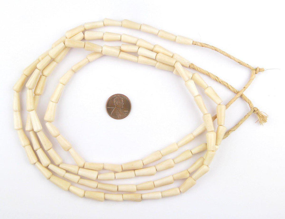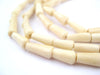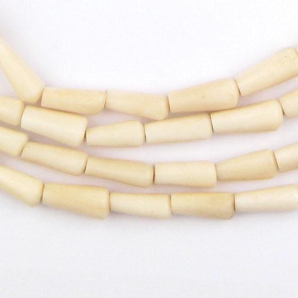 Admire this unusual strand of bone beads from Kenya. While Kenyan bone beads are common in a variety of shapes and styles, these beads come in a hard-to-find and unusual shape. East African bone beads are handcrafted by artisans using recycled cow bone. Each bead is individually carved and polished, and is truly one of a kind. These beads measure approximately 14-18 x 5-8mm, with a hole size of slightly larger than 1mm. Strands measure approximately 30", and have approximately 50 beads each. Two strands pictured. Each strand sold individually. These are a great find for any beader looking to do something truly unique with their work!