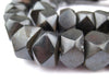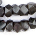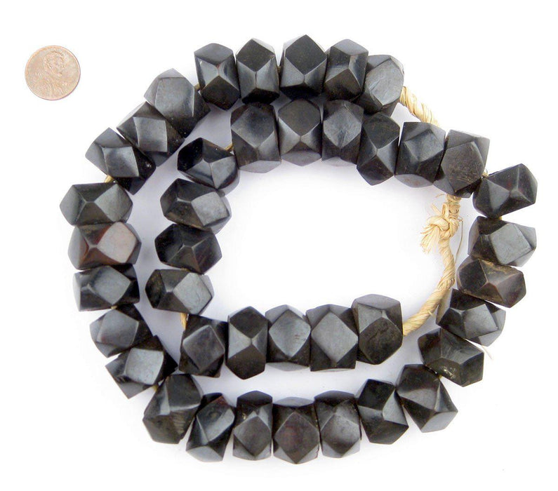 Admire this unusual strand of bone beads from Kenya. While Kenyan bone beads are common in a variety of shapes and styles, these beads come in a more unusual faceted shape. East African bone beads are handcrafted by artisans using recycled cow bone. Each bead is individually carved and polished, and is truly one of a kind. These beads measure approximately 13-15 x 20-22mm, with a hole size of 3mm. Strands measure approximately 26", and have approximately 40 beads each. These beads are a very dark brown batik color which many might consider black. These are a great find for any beader looking to do something truly unique with their work!