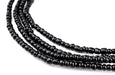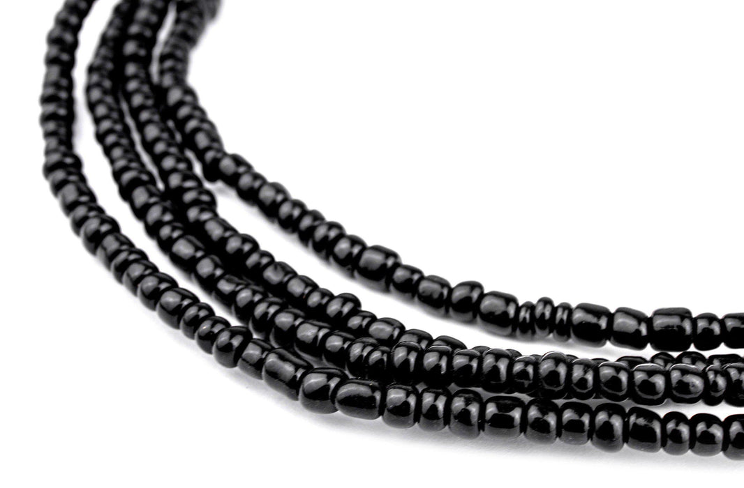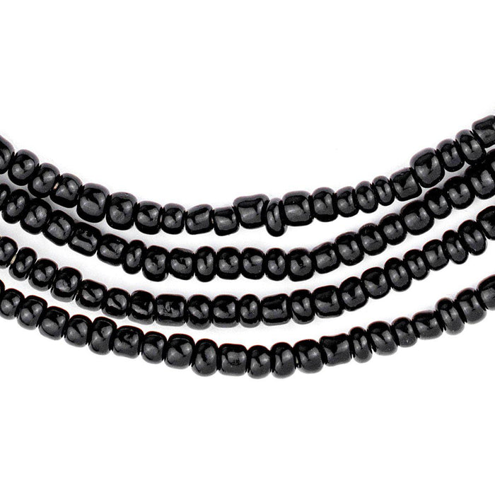 Two strands of black color small glass beads from Ghana. Each bead measures approximately 4mm in diameter by 3mm in length. Some variation in individual beads is shown as pictured.