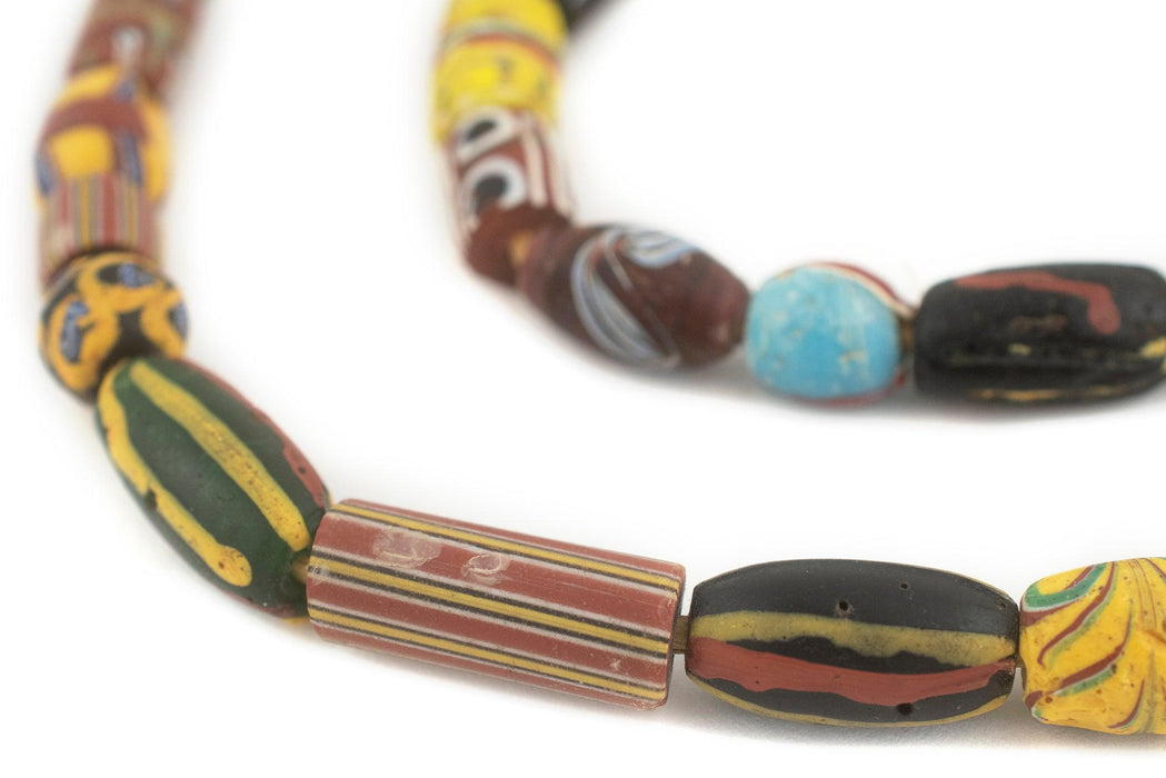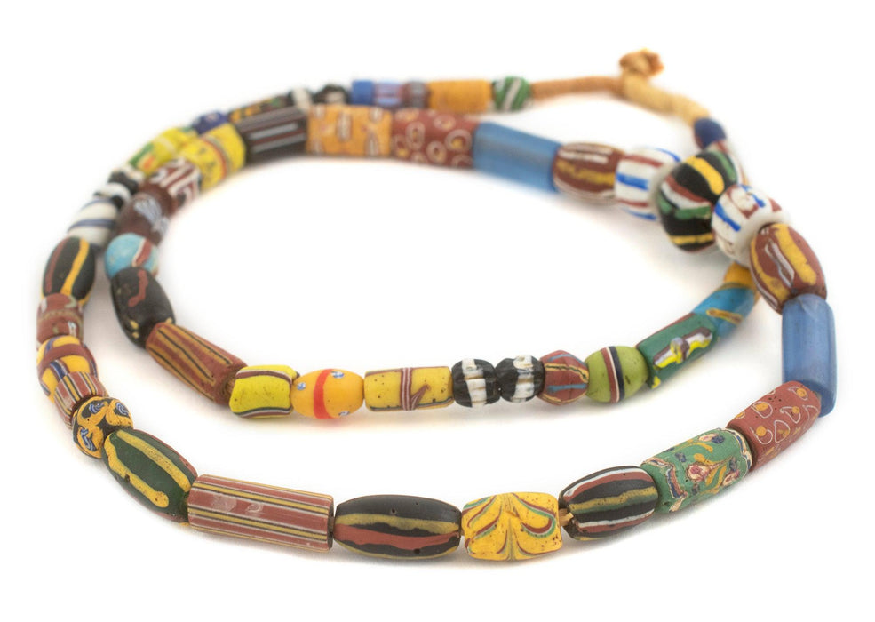 Looking for a truly unique strand of antique mixed trade beads? Then look no further. This beautiful strand of old african trade beads contains a medley of hard to find beads. Each strand is unique but strands may include special beads including Bodom beads, Murano Red good beads, Millefiore, Red white and blue beads, French cross, King beads, Old powder glass beads, Dog tooth beads, Cornaline d'Aleppo Venetian Trade Beads, Russian Blue, Floral Venetian Beads, and many other unusual varieties of old African Trade Beads. These beads are for the designer and collector alike. You will receive the exact strand pictured. Some beads may show signs of age. These mixed beads are truly exceptional!