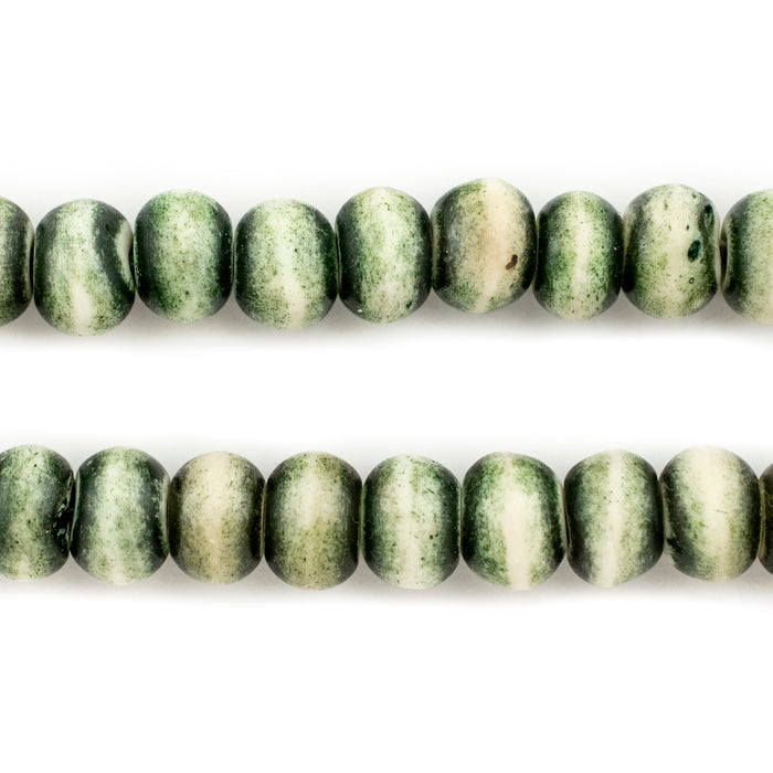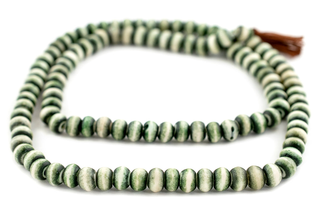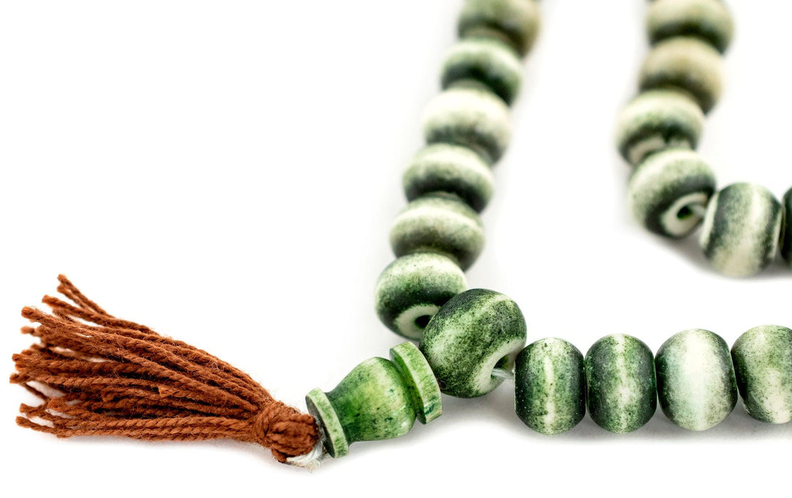 This strand of rustic green bone beads comes from Nepal. Pay attention and you will notice that each bead is 100% unique and has its own character. Each bead measures approximately 8 x 11-12mm, with a hole size of approximately 3mm. You will receive one strand measuring approximately 34". There are around 108 beads on each strand. Get yours today!