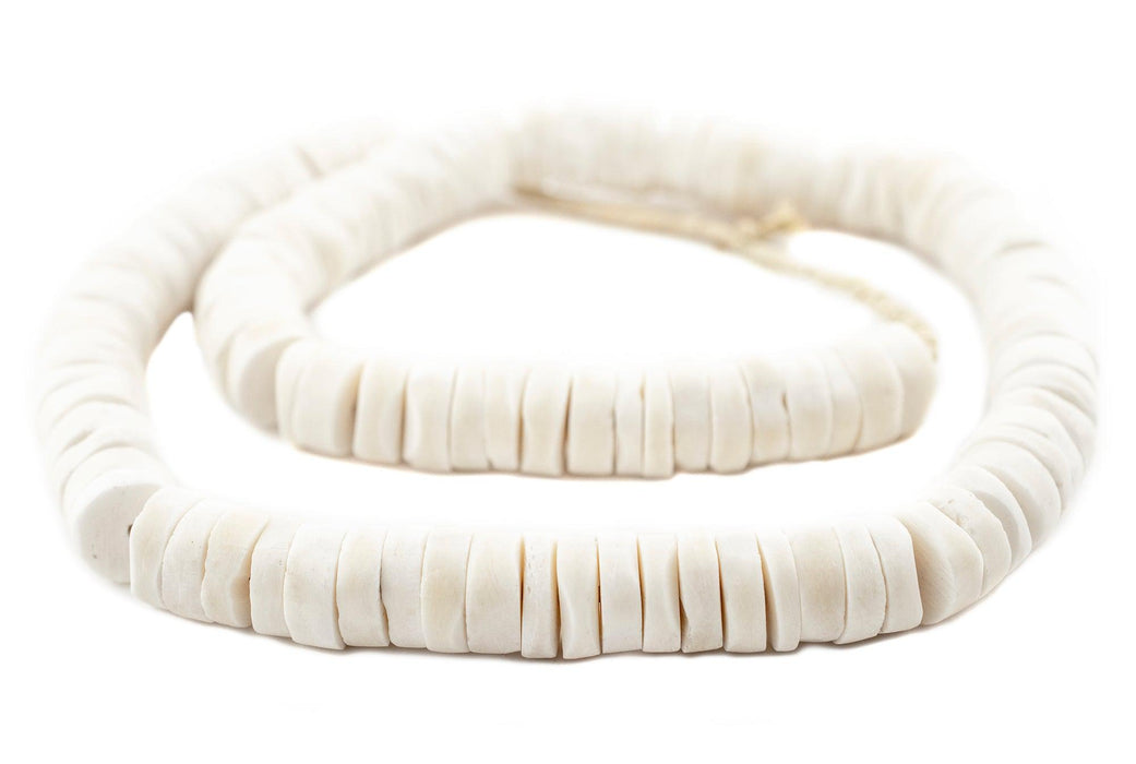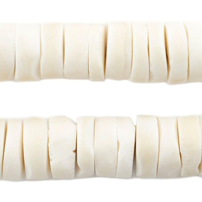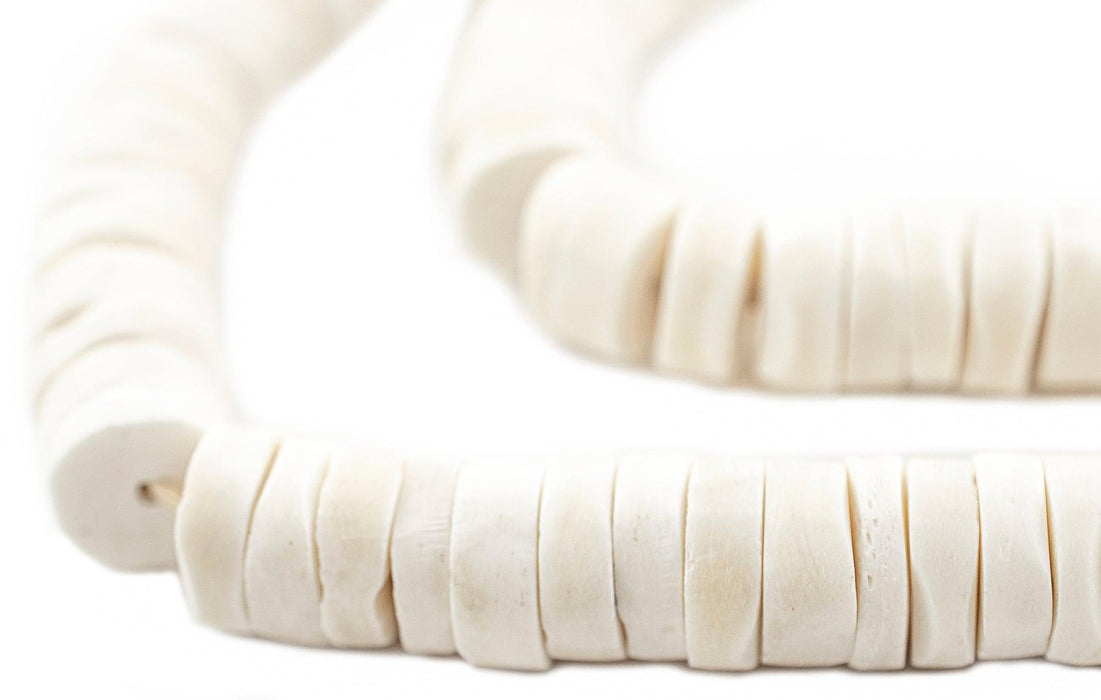 This strand of 16-18mm white bone disk beads has a classic and timeless look that's perfect for any jewelry project. Their lovely organic material – bone – will help bring a unique feel to your project, and add a one-of-a-kind, earthy quality that can’t be beaten. Each bead measures approximately 5-8 x 16-18mm with a hole size of approximately 2mm. You will receive a full strand measuring approximately 30".