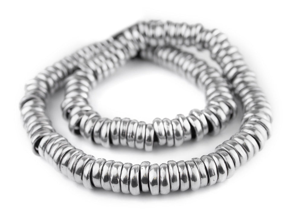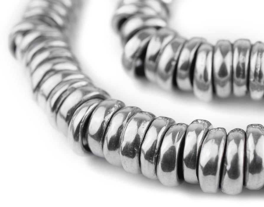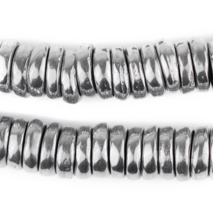 These tribal aluminum beads are made in a design traditional to the Mursi people. The Mursi are a pastoralist tribe who live in various parts of Ethiopia, and are known for their unique and pronounced jewelry designs. Aluminum is a common choice for jewelry designers because it is lighter in weight and known to resist rust, while still resembling genuine silver. Each bead measures approximately 5 x 15-16mm with a hole size of approximately 9mm. You will receive a full strand measuring 24" long. Incorporate these beads into your next design!
