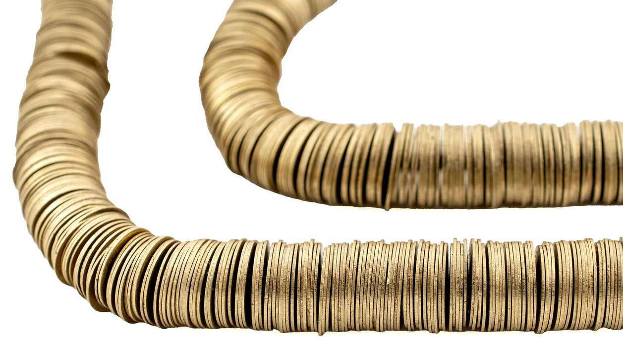 Brighten up your designs with these useful Brass Disk Heishi Beads. The flat shape of these beads makes them highly versatile and they may be used as a spacer or accent bead in almost any unique jewelry design. Every strand is approximately 8.5" in length. Each bead is about 0.3 x 10mm with an approximately 1mm stringing hole. Add this Professional Designer Bead Style to your craft kit today.