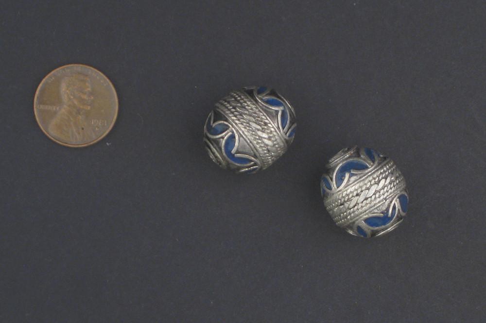 Colorful and eye-catching, this artisanal enameled Berber bead pendant is unique to behold. Accented silver-plated and accented in a brilliant blue enamel, it can be worn alone or as part of a special necklace. Design of beads may vary slightly. These beads are sold as a set of two pieces.