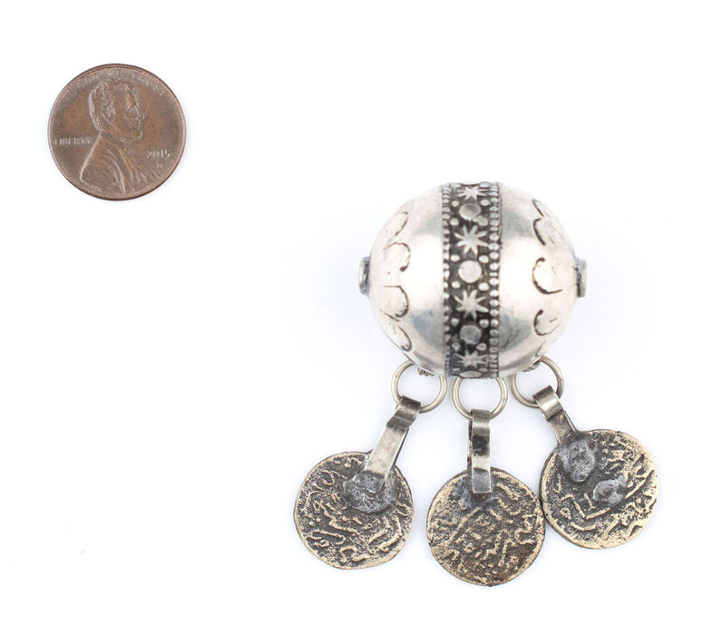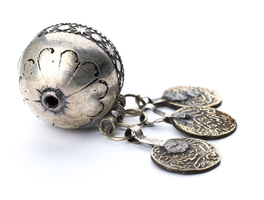 Beautiful unique silver-plated Moroccan bead with tassels. Each bead has been handcrafted and is a little bit different. Size is approximately 30 x 26mm, with hole size measuring 2mm. Each pendant is unique and may vary slightly from photo.