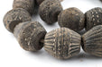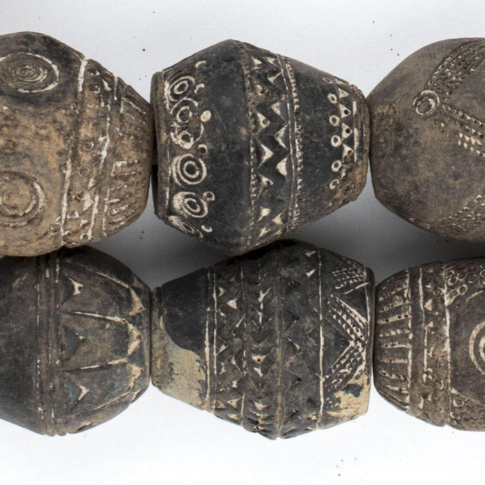 Admire these exceptional Mali Clay Spindle Beads. These beads derive their name from their use as a part of the traditional tool used by the people of West Africa to fashion thread. Repurposed as beads, each piece has been individually decorated with traditional African motifs. Look carefully and you will see that each bead is unique. Each strand will consist of approximately 18-19 beads measuring 30-35mm wide by 26-30mm in diameter. This is an unusual shape that is not found as often. Strand pictured is representative of the quality and design of the beads however each strand is unique and may differ in exact composition of beads. These would make a great decor for any room or as centerpiece beads for your unique designs.