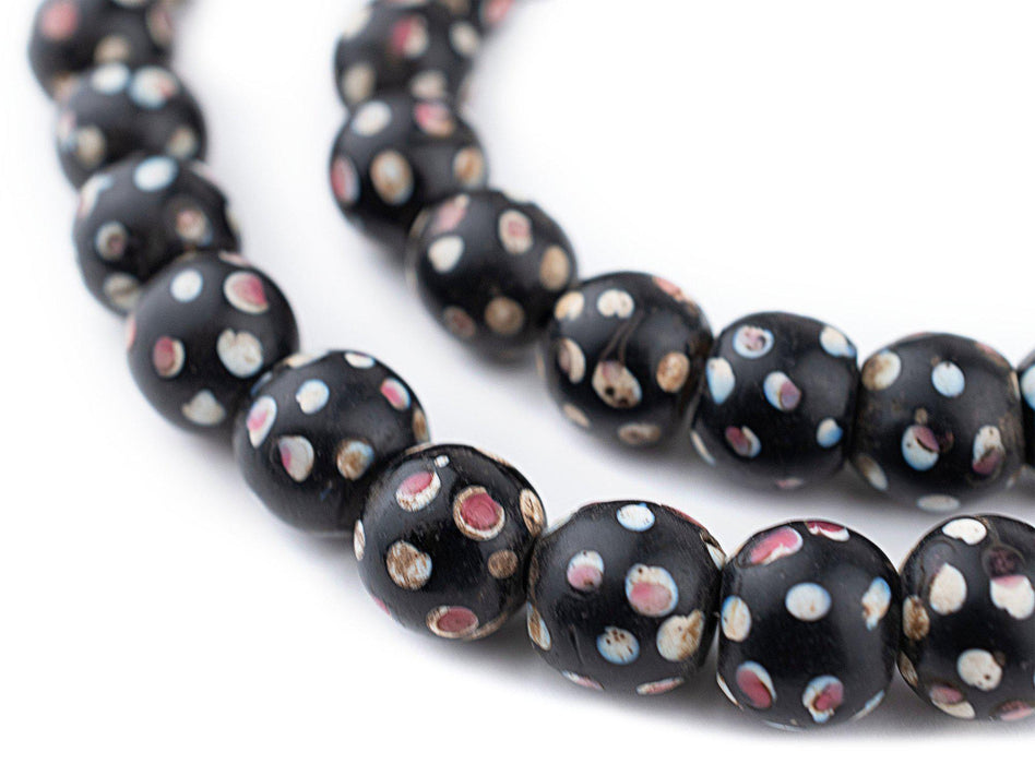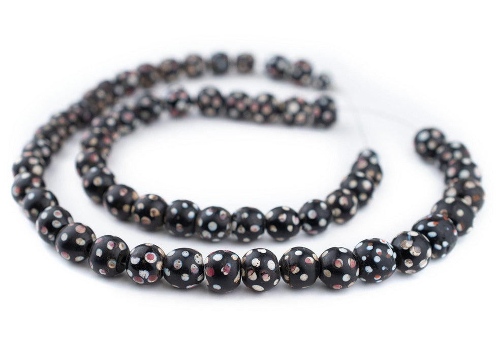 These exceptional black Skunk Eye beads are a beauty to behold. Old trade beads such as these originate in Venice, Italy where they were produced and sent to Africa. Each bead has been crafted by an artisan by applying the molten white glass dots to the black base of the bead. Black skunk beads are found in a number of different variants both in East Africa as well as West Africa in countries such as Ethiopia, Ghana, and Nigeria. Thee particular beads are in relatively good condition and believed to be of Ethiopian provenance. Individual beads measure approximately 12mm in diameter with about 58 beads / strand. You will receive the exact strand pictured.