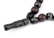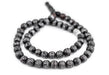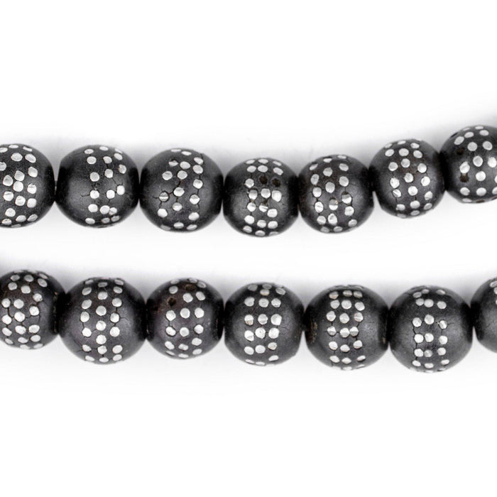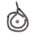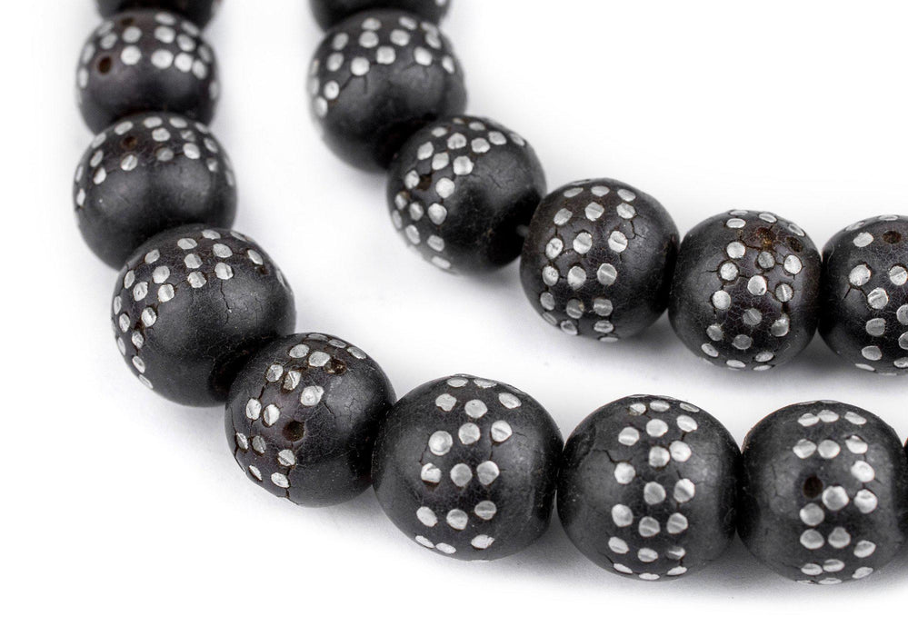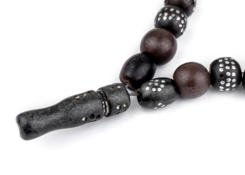 These genuine Islamic prayer beads are a traditional craft of the Arabian Peninsula. Prized for generations, beads such as these are intricately inlaid by master craftsmen to create the unique and beautiful designs that characterize this unique art form. Look carefully and you will see that each silver dot has been individually applied and that no two beads are alike. Commonly referred to as Black Coral, these rare and highly sought-after beads are believed by some to have mystical properties. This unusual piece would be considered a special strand to be used for prayer or meditation. Yemen has historically been a primary source of Black Coral beads. Such beads are also found in other parts of the Islamic world including North and East Africa where they have been distributed through the years by merchants and traders. Antique beads such as these have some age and will show signs of wear including imperfections. This unique strand of round-shaped beads has been nicely finished with a traditional end-piece and weighs approximately 62 grams. You will receive the exact strand pictured.
