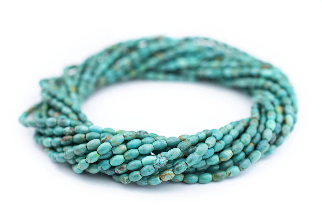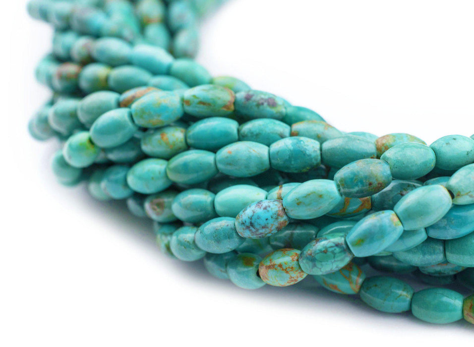 The striking color of these Aqua Turquoise RIce Beads will be sure to catch an eye. Many believe Turquoise to be a stone of protection and make for a great natural stone bead to design with. The unique shape of these stone beads makes them extremely versatile and easy to use. Each strand measures approximately 16" in length. Each bead is about 6 x 4mm with a roughly 1mm hole. Multiple strands pictured. Each strand is sold individually. Hard to find color. Each strand is unique and may slightly vary from the picture.