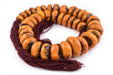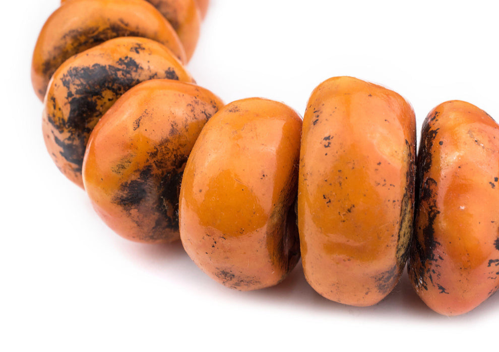 Prized for their unequaled beauty and striking color, Moroccan Amber Resin Beads have been prized for centuries among the Berber tribes of the mountainous regions of North of Africa. In traditional families, such beads conveyed both status and wealth and have been passed down from one generation to the next. Due to their unique character, these artisanal amber resin beads may be worn "as-is" or may be used to embellish original jewelry designs. Both approaches are apparent in traditional Berber adornments. Individual beads measure 13-27 x 27-47mm. This is a HUGE strand. Take a look at the photo and take note of the size of the penny!