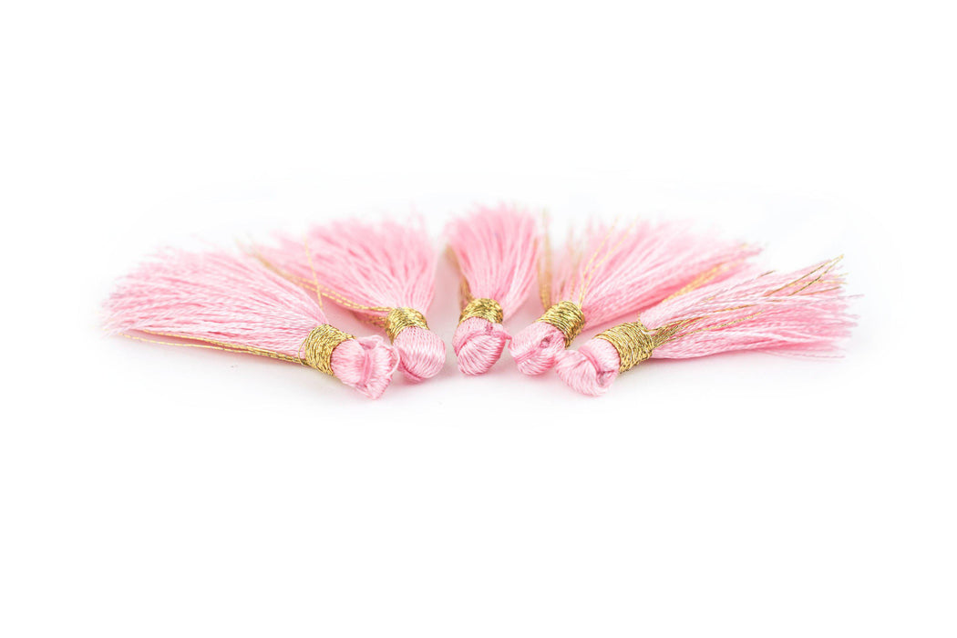 Look no further! These genuine silk tassels have been individually handmade by an expert of the craft. They are crafted from authentic Indian silk which is highly refined and world renown. Specially made for The Bead Chest, each high quality tassel is wrapped with a gold thread. Available in 20+ fun colors and 4 different sizes, you’ll find in our collection a tassel for almost every need. Each purchase of these pink color tassels will ship as a pack of five pieces. Individual tassels measure approximately 3 centimeters (1.2 inches) in length. May be used in jewelry designs, home decor, and art projects galore. Mix and match your favorite styles today!