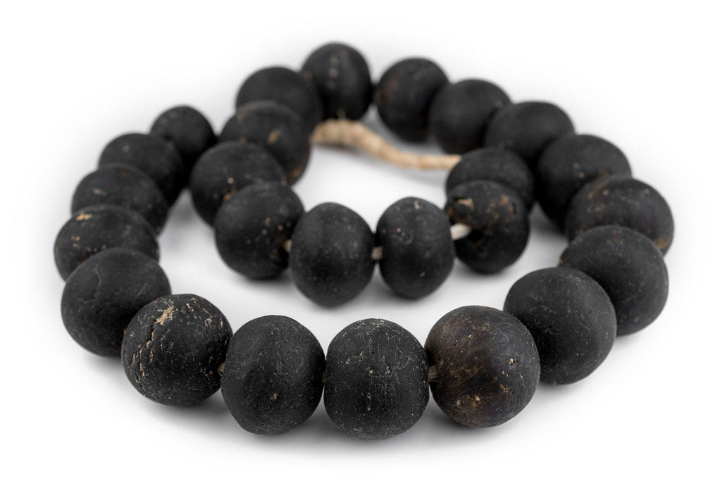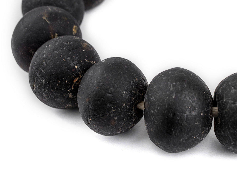 Take a look at this exceptionally large strand of jumbo-sized blackened brown recycled glass beads. Large beads such as these are hard to find and even harder to find in good condition. The journey from Africa can sometimes be unkind to such large beads! These beads are sure to make an impression wherever they go. Use them as centerpieces for special jewelry, as adornments for interior design, or even as a wall hanging to decorate your favorite room. You will receive a 30" strand with approximately 25 beads. Recycled glass beads are a type of indigenously produced African bead from Ghana West Africa. These special beads are made using an old method that has been used for centuries. The glass itself is derived from a variety of recycled sources including old beverage and medicine bottles. The procedure for making the beads consists of a number of steps whereby powdered glass is poured into molds of clay and baked in a specialized oven. These beads are produced in large part by the Krobo tribe and are environmentally friendly. Some beads may have chips or internal fractures due to long journey. Non-USA buyers, please note that a heavy-weight surcharge may apply for this item. Please inquire in advance if you would like to pre-confirm this fee.