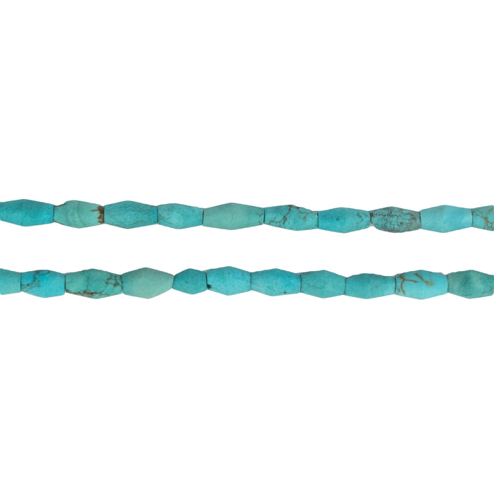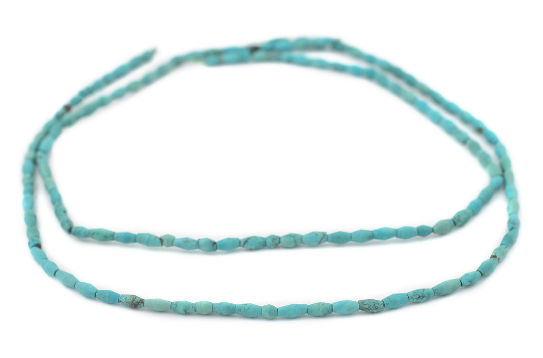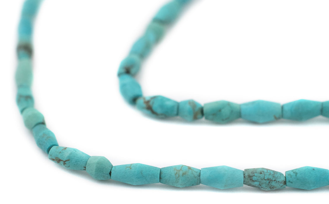 Indulge your eyes in these beautiful turquoise beads brought to you from the mountainous wilds of Afghanistan. The mineral rich landscape of Central Asia has been a source of treasured stones for at least three millennia. These delightful, handcrafted gemstone beads come in a special bicone shape, measuring approximately 4 x 3mm, with holes measuring 1mm. Each strand is approximately 15" long. Turquoise stone has been treasured since time immemorial as a protective talisman. Interestingly, it derives its name in the English language from the Turks who were the first to introduce it to the Western World. Add these beads to your collection today! Multiple strands pictured. Each strand sold individually.
