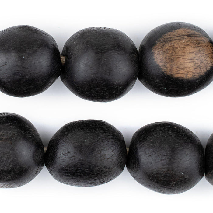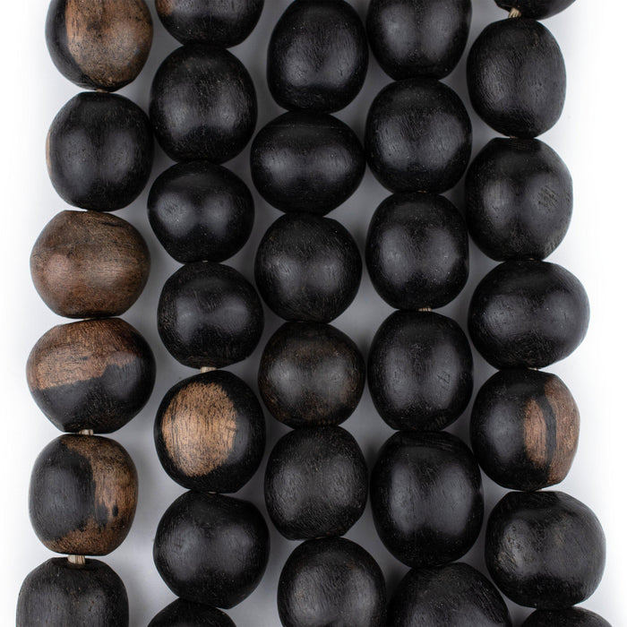 This strand of natural wooden beads is hand-carved from genuine ebony, pruned from aged trees in the Malian countryside. Beads range in size on each strand and may vary between 16-20mm in diameter and will not necessarily cover this entire range. Hole size is approximately 3mm, and strand measures approximately 36 inches long. These beads are made by hand from natural wood and will show some imperfections. Each strand is unique. Great for home decor, or to use in your own creative jewelry designs!