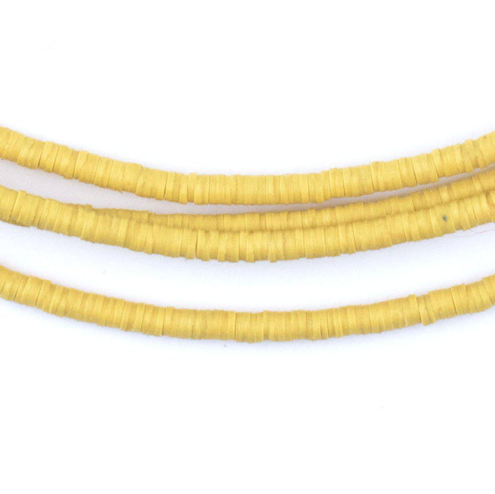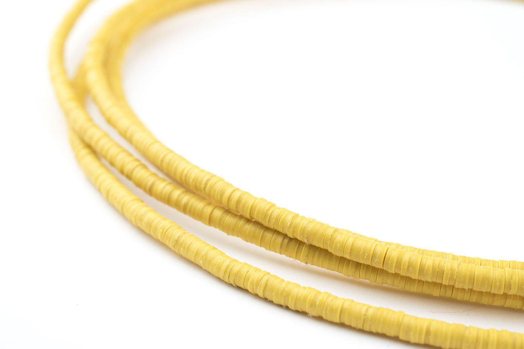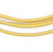 Take a look at this beautiful strand of African vinyl beads yellow color. Beads such as these are found in Ghana and Nigeria where they are sometimes worn as waist beads. Older versions of vinyl beads were said to be made from recycled phonograph records. This strand measures approximately 34" long with individual beads measuring 0.28 x 3mm. These beads are light and fun to wear and also versatile for jewelry designs. Shade may vary. Multiple strands pictured. Each strand is sold individually.