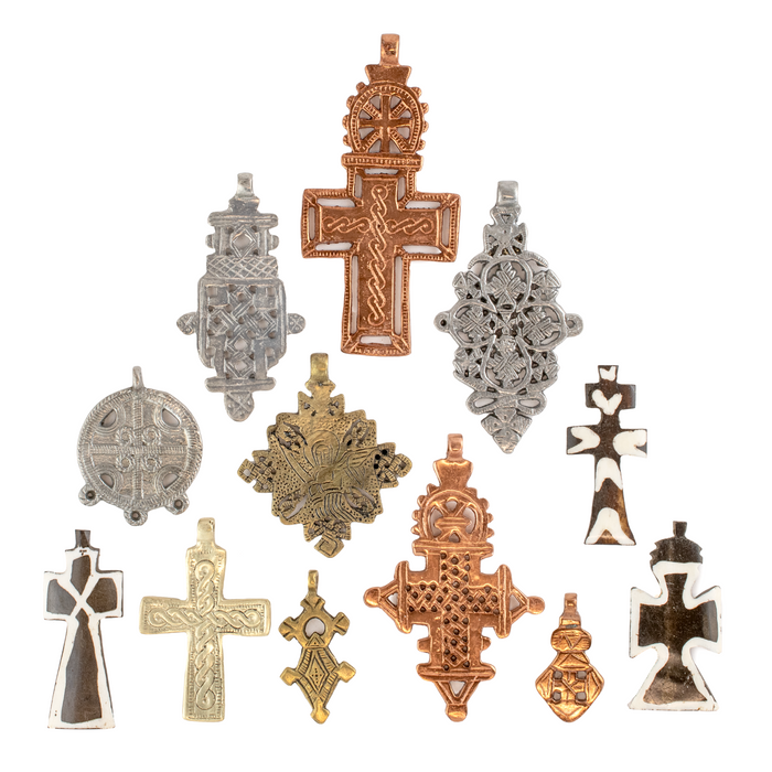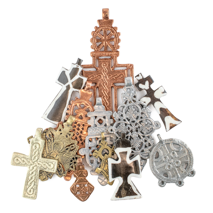 Discover the 12-Piece Cross Pendant Bundle—a curated set of distinctive pendants in brass, copper, silver, and batik bone. This collection features 3 pendants of each style, blending the artistry of traditional Ethiopian-inspired metal designs with handcrafted batik bone crosses. Each bone pendant showcases the intricate batik patterns that make it truly unique.