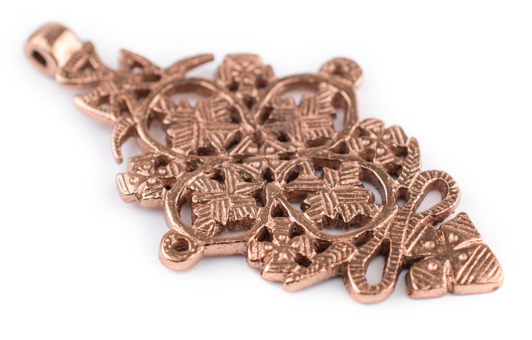 This Coptic Cross design was made by the artisan community of Ethiopia. Crosses are commonly worn by Ethiopians as a sign of one's faith. Pendants such as these are generally worn in necklace form. You can either run a chain through it, or incorporate it into a more intricate jewelry design! Each pendant measures approximately 45 x 85mm, with a hole size of approximately 3-4mm. Beautiful pendant at a great price! This artisan product is made using premium copper electroplating over brass to make these copper finish customer favorites.