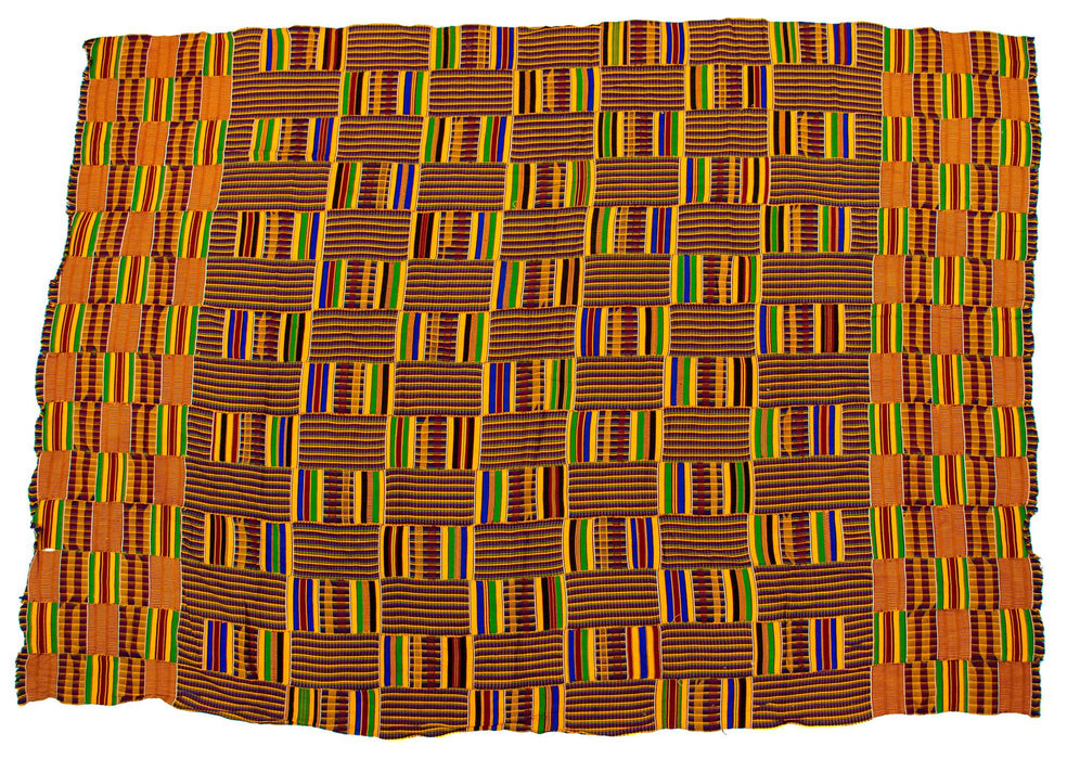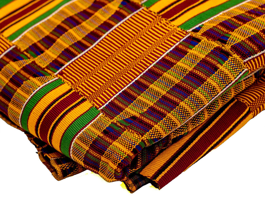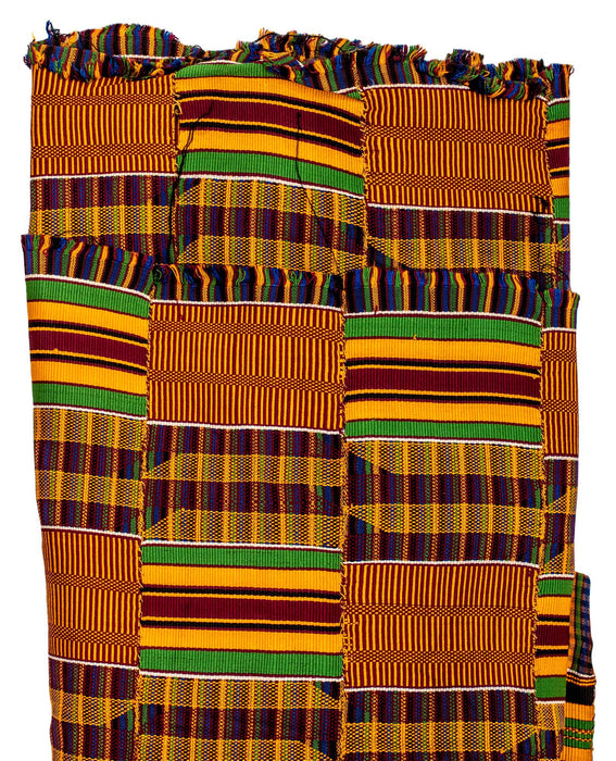 Admire the rich colorful beauty of this authentic vintage Ghanaian Kente Cloth. Woven from cotton, handmade textiles such as this play a central role in the artistic tradition of many West African countries where they are traditionally worn as clothing. Kente cloths are made by the Akan people and were traditionally used solely for royal courts and prestigious occasions. Look carefully and you will see that each piece has its own unique and distinctive pattern. This colorful and vibrant fabric can be used for all kinds of unique design projects. Use it as a table cloth, wall hanging, to make custom clothes, or simply as a colorful accent for your favorite room. Clothes measures approximately 51-52 x 77-76". Each cloth is unique and may vary slightly from photo.