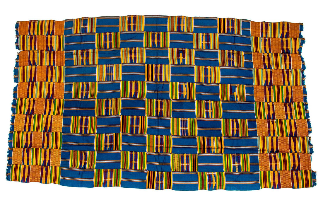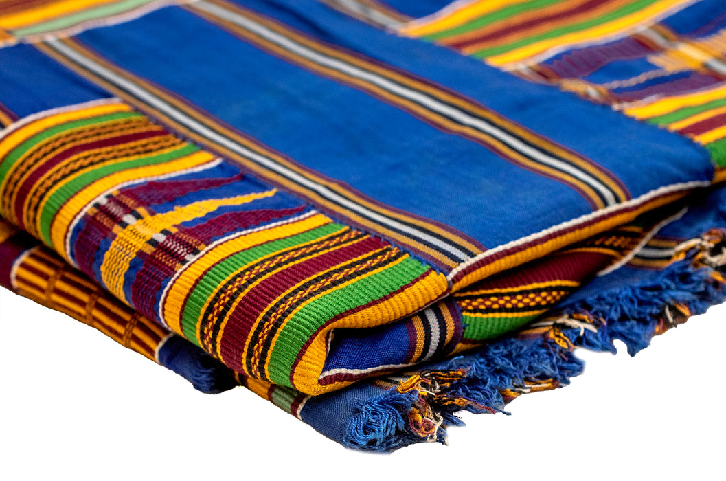 Admire the rich colorful beauty of this authentic vintage Ghanaian Kente Cloth. Woven from cotton, handmade textiles such as this play a central role in the artistic tradition of many West African countries where they are traditionally worn as clothing. Kente cloths are made by the Akan people and were traditionally used solely for royal courts and prestigious occasions. Look carefully and you will see that each piece has its own unique and distinctive pattern. This colorful and vibrant fabric can be used for all kinds of unique design projects. Use it as a table cloth, wall hanging, to make custom clothes, or simply as a colorful accent for your favorite room. Clothes measures approximately 40-41 x 73-74". Each cloth is unique and may vary slightly from photo.