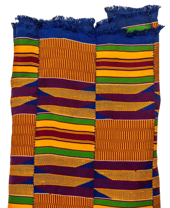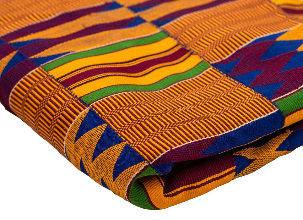 Admire the rich colorful beauty of this authentic vintage Ghanaian Kente Cloth. Woven from cotton, handmade textiles such as this play a central role in the artistic tradition of many West African countries where they are traditionally worn as clothing. Kente cloths are made by the Akan people and were traditionally used solely for royal courts and prestigious occasions. Look carefully and you will see that each piece has its own unique and distinctive pattern. This colorful and vibrant fabric can be used for all kinds of unique design projects. Use it as a table cloth, wall hanging, to make custom clothes, or simply as a colorful accent for your favorite room. Clothes measures approximately 38-40 x 71-72". Each cloth is unique and may vary slightly from photo.