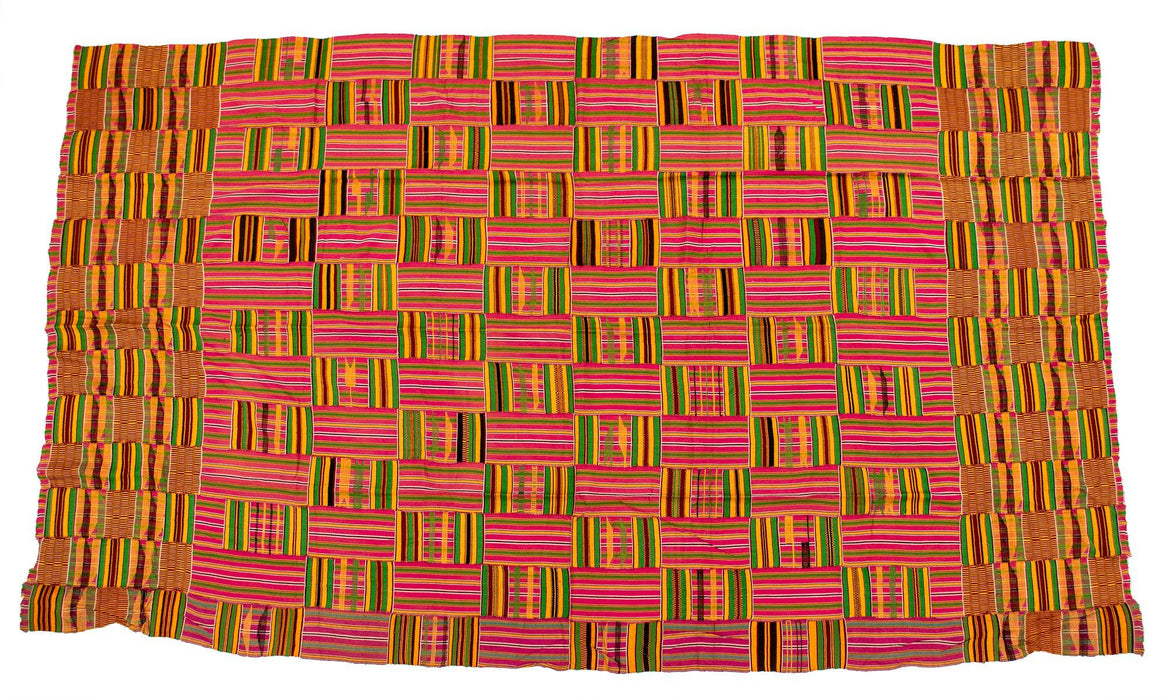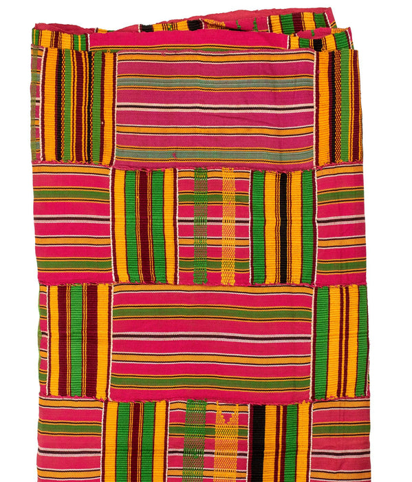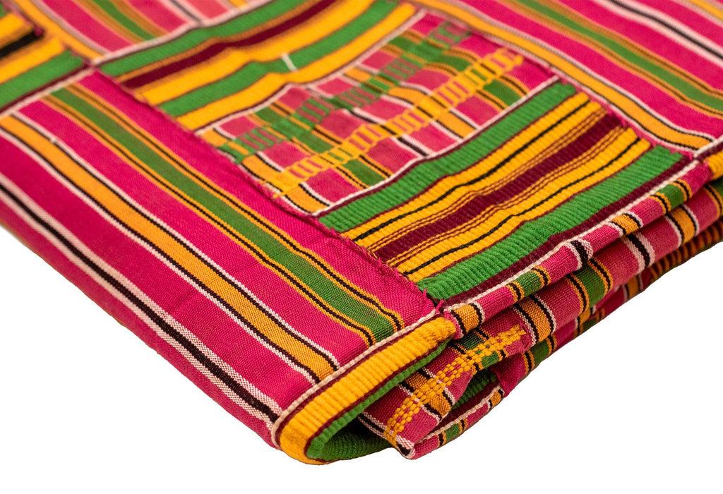 Admire the rich colorful beauty of this authentic vintage Ghanaian Kente Cloth. Woven from cotton, handmade textiles such as this play a central role in the artistic tradition of many West African countries where they are traditionally worn as clothing. Kente cloths are made by the Akan people and were traditionally used solely for royal courts and prestigious occasions. Look carefully and you will see that each piece has its own unique and distinctive pattern. This colorful and vibrant fabric can be used for all kinds of unique design projects. Use it as a table cloth, wall hanging, to make custom clothes, or simply as a colorful accent for your favorite room. Clothes measures approximately 39-49 x 60-75". Each cloth is unique and may vary slightly from photo.