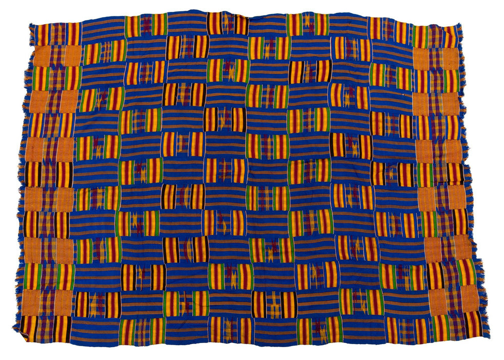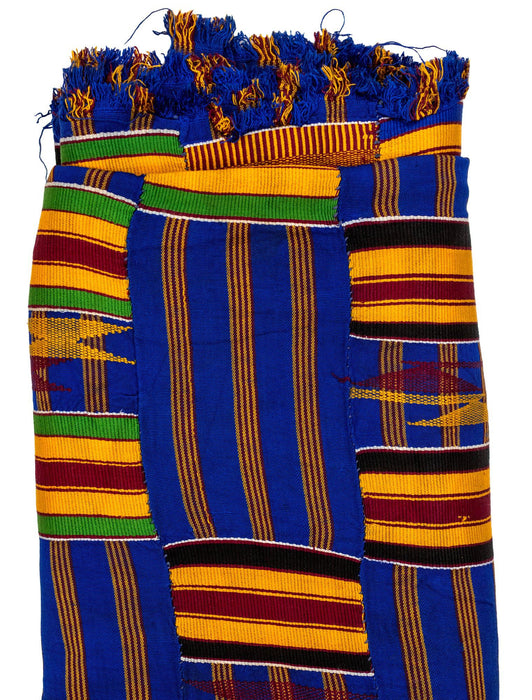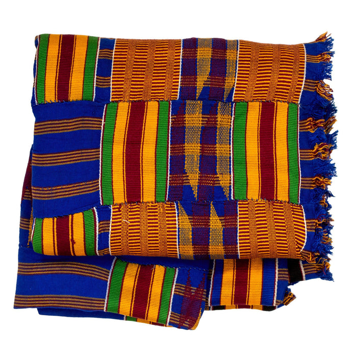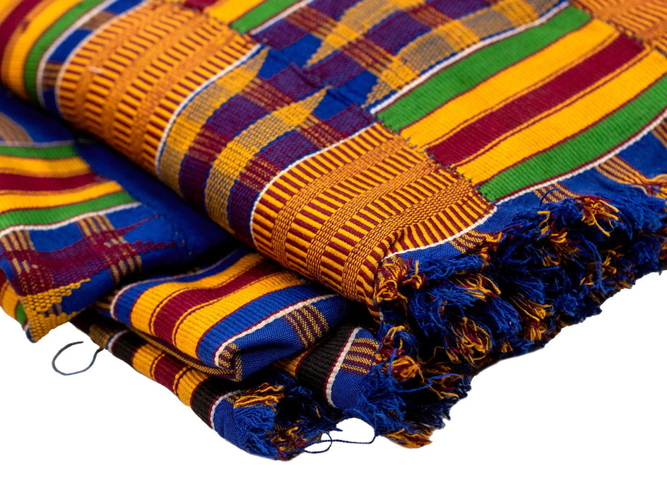 Admire the rich colorful beauty of this authentic vintage Ghanaian Kente Cloth. Woven from cotton, handmade textiles such as this play a central role in the artistic tradition of many West African countries where they are traditionally worn as clothing. Kente cloths are made by the Akan people and were traditionally used solely for royal courts and prestigious occasions. Look carefully and you will see that each piece has its own unique and distinctive pattern. This colorful and vibrant fabric can be used for all kinds of unique design projects. Use it as a table cloth, wall hanging, to make custom clothes, or simply as a colorful accent for your favorite room. Clothes measures approximately 43-44 x 60-61". Each cloth is unique and may vary slightly from photo.