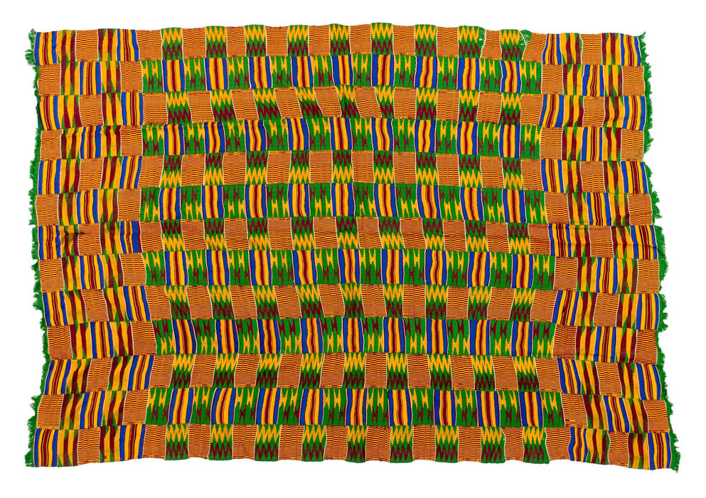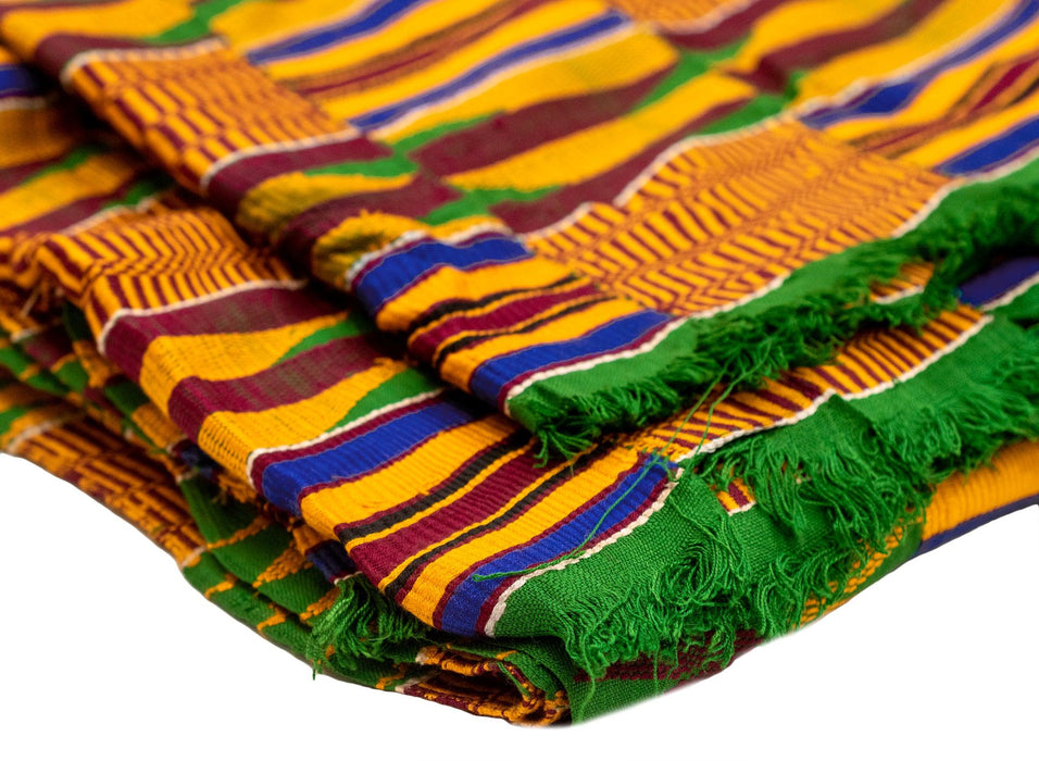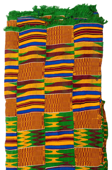 Admire the rich colorful beauty of this authentic vintage Ghanaian Kente Cloth. Woven from cotton, handmade textiles such as this play a central role in the artistic tradition of many West African countries where they are traditionally worn as clothing. Kente cloths are made by the Akan people and were traditionally used solely for royal courts and prestigious occasions. Look carefully and you will see that each piece has its own unique and distinctive pattern. This colorful and vibrant fabric can be used for all kinds of unique design projects. Use it as a table cloth, wall hanging, to make custom clothes, or simply as a colorful accent for your favorite room. This cloth measures approximately 40-44 x 71-75" and is one of a kind. You will receive the exact cloth shown in the photograph!