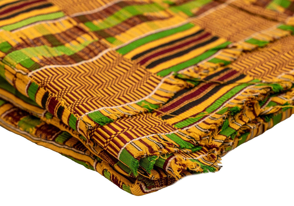 Admire the rich colorful beauty of this authentic vintage Ghanaian Kente Cloth. Woven from cotton, handmade textiles such as this play a central role in the artistic tradition of many West African countries where they are traditionally worn as clothing. Kente cloths are made by the Akan people and were traditionally used solely for royal courts and prestigious occasions. Look carefully and you will see that each piece has its own unique and distinctive pattern. This colorful and vibrant fabric can be used for all kinds of unique design projects. Use it as a table cloth, wall hanging, to make custom clothes, or simply as a colorful accent for your favorite room. This cloth measures approximately 40-44 x 71-75" and is one of a kind. You will receive the exact cloth shown in the photograph!