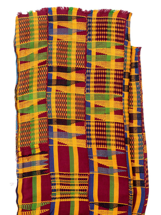 Admire the rich colorful beauty of this authentic vintage Ghanaian Kente Cloth. Woven from cotton, handmade textiles such as this play a central role in the artistic tradition of many West African countries where they are traditionally worn as clothing. Kente cloths are made by the Akan people and were traditionally used solely for royal courts and prestigious occasions. Look carefully and you will see that each piece has its own unique and distinctive pattern. This colorful and vibrant fabric can be used for all kinds of unique design projects. Use it as a table cloth, wall hanging, to make custom clothes, or simply as a colorful accent for your favorite room. This cloth measures approximately 40-44 x 71-75" and is one of a kind. You will receive the exact cloth shown in the photograph!