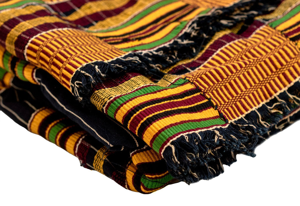 Admire the rich colorful beauty of this authentic vintage Ghanaian Kente Cloth. Woven from cotton, handmade textiles such as this play a central role in the artistic tradition of many West African countries where they are traditionally worn as clothing. Kente cloths are made by the Akan people and were traditionally used solely for royal courts and prestigious occasions. Look carefully and you will see that each piece has its own unique and distinctive pattern. This colorful and vibrant fabric can be used for all kinds of unique design projects. Use it as a table cloth, wall hanging, to make custom clothes, or simply as a colorful accent for your favorite room. This cloth measures approximately 40-44 x 71-75" and is one of a kind. You will receive the exact cloth shown in the photograph!